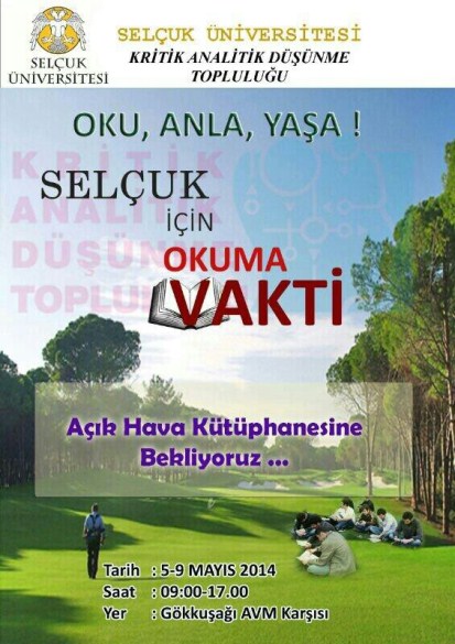 Selçuk Üniversitesi Kritik-Analitik Düşünme Topluluğu, 05-09 Mayıs 2014 tarihlerinde Selçuk Üniversitesi Gökkuşağı Alışveriş Merkezi karşısında Açık Hava Kütüphanesi ‘Okuma Vakti’ etkinliği düzenliyor. |